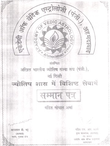 | 26. | Certificate of Honor on 7th April, 2002 | All India Council of Ved Vigyaan- Meerut | Appreciable work in Astrology. |